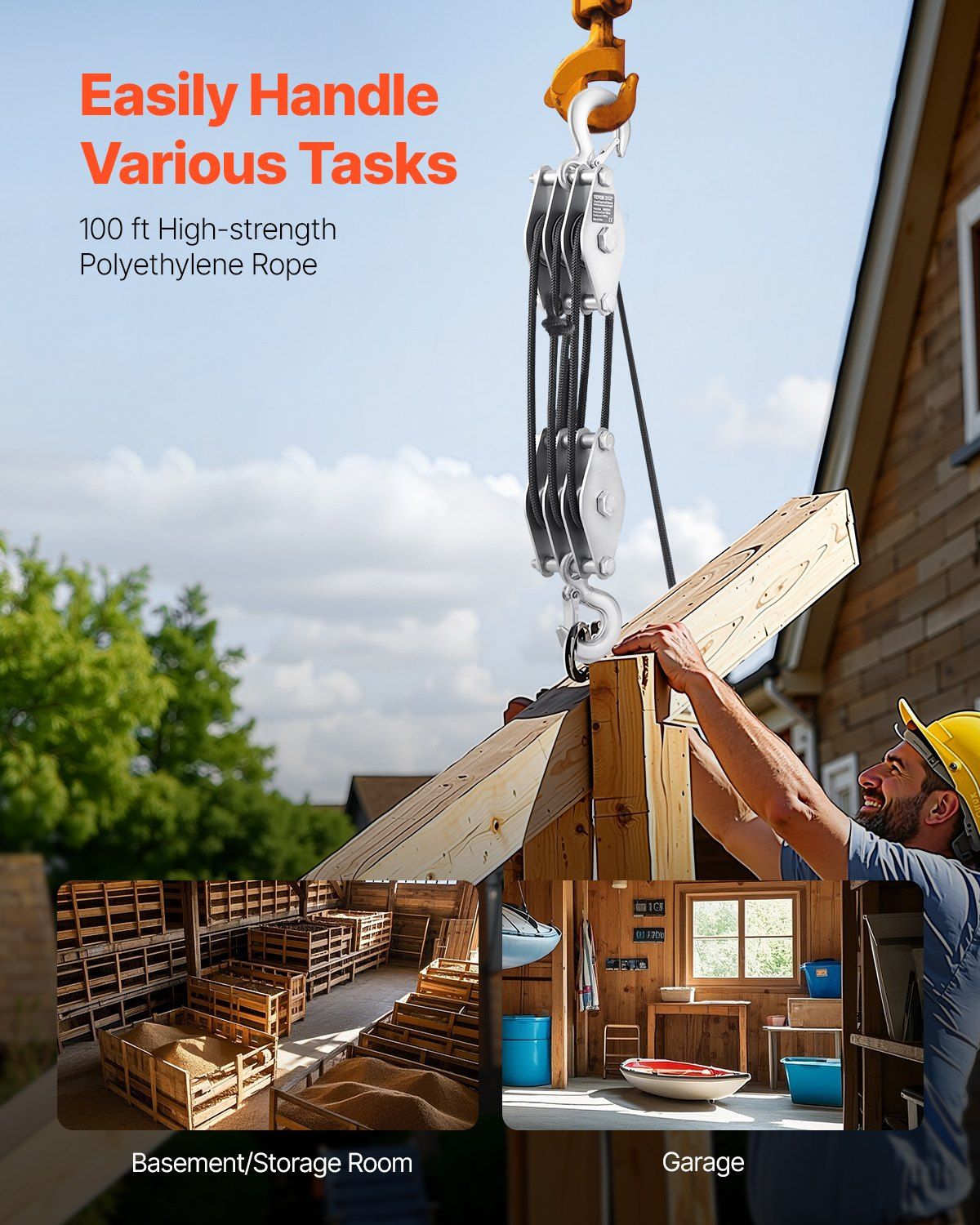 Equipped with 100 feet of high-strength polyester rope, this pulley system is built to last. It's resistant to wear and tear, won't age or break easily, and can lift heavy objects to various heights. Ideal for all your lifting needs, whether in your garage, workshop, or home.